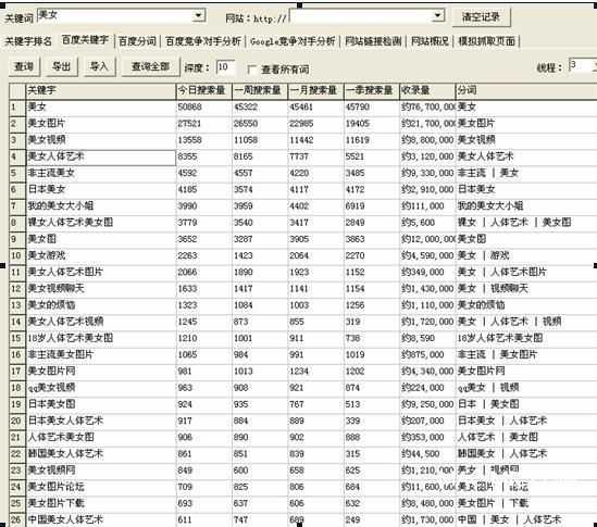 通過(guò)圖5大家可以看到,我通過(guò)這個(gè)工具輸入關(guān)鍵詞“美女”我就得到了和美女相關(guān)的一些熱門(mén)詞的百度指數(shù)情況。假設(shè)我要去做美女圖片站的SEO,就知道除了主關(guān)鍵詞“美女”還有哪些詞有比較大的搜索量,值得我去做SEO。